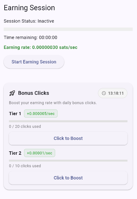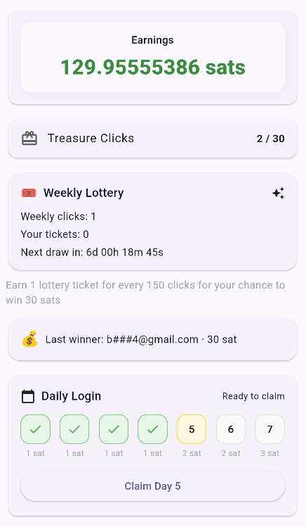 Tap through daily tasks, watch ads, and collect satoshis — simple, fun, and rewarding.